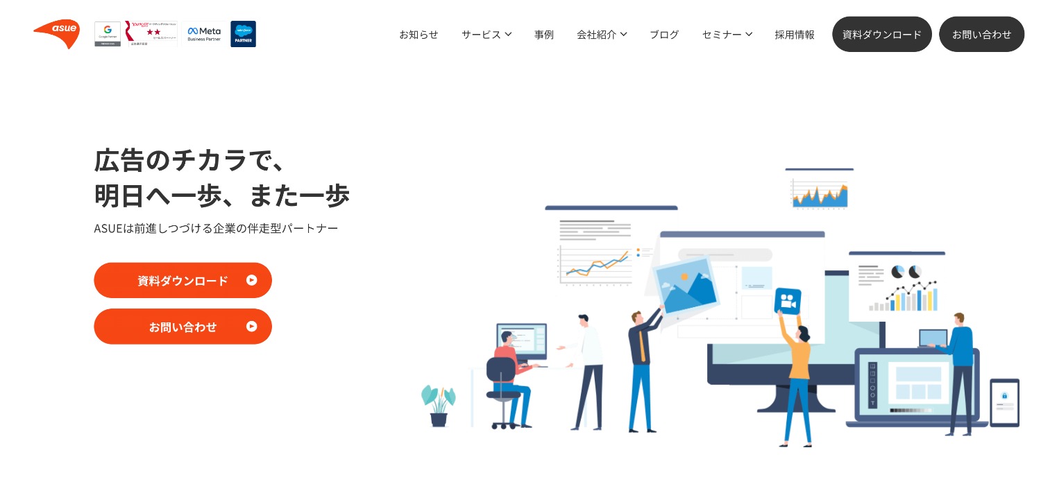 ASUE株式会社」様は、Web広告運用を軸に事業成長を総合的にサポートしてくれるマーケティング支援会社です。2012年の設立以来、「感動をとどける」というミッションのもと、飲食店の集客に欠かせないマーケティング施策に幅広く対応してくれます。
