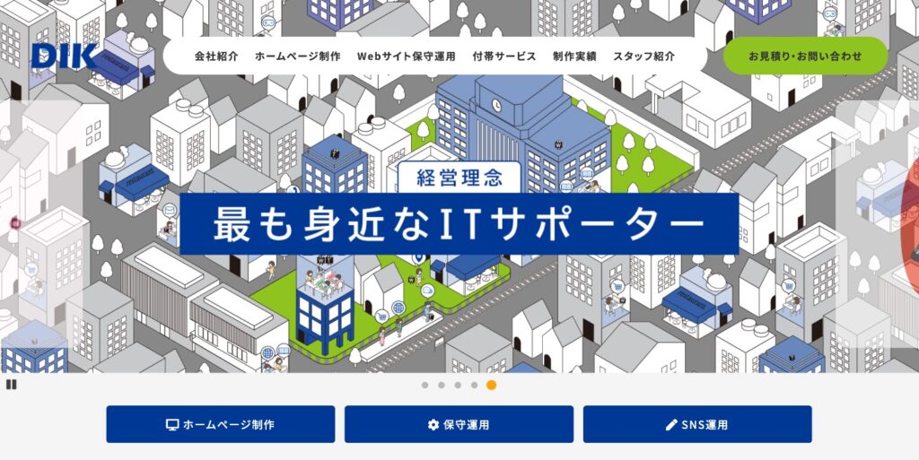 「株式会社ディーアイケイ(DIK)」は、埼玉県本庄市を拠点に創業27年の歴史を持つホームページ制作・保守会社です。経営理念「最も身近なITサポーター」のもと、「相談しやすさ日本一」を目指し、企画から制作・保守まですべて正社員が対応。700サイトを超える制作実績を有しています。