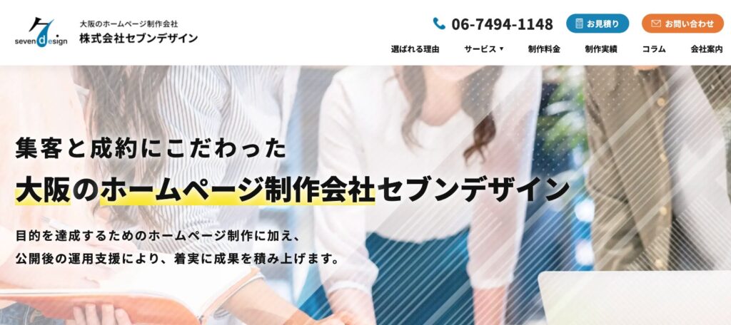 「株式会社セブンデザイン」は、大阪府大阪市を拠点とする、創業15年以上のホームページ制作会社です。「集客と成約にこだわった」サイト制作を掲げ、勘や思い込みに頼らず、市場の動向や競合の状況を冷静に分析したうえで、根拠に基づいた緻密な設計を行うことが選ばれる理由です。サービスの核となるのは、