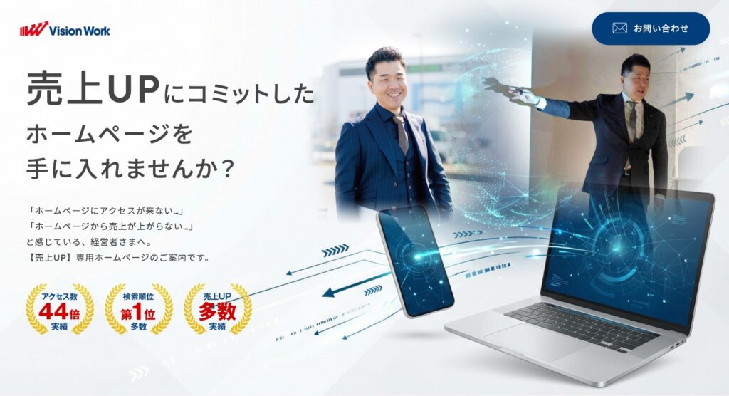 「株式会社ビジョンワーク」は、埼玉県越谷市を拠点とするホームページ制作会社です。「売上UPにコミットしたホームページ制作」を掲げ、見た目のデザインにとどまらず、アクセス増加・売上向上という目的に特化したサイト制作を行っています。