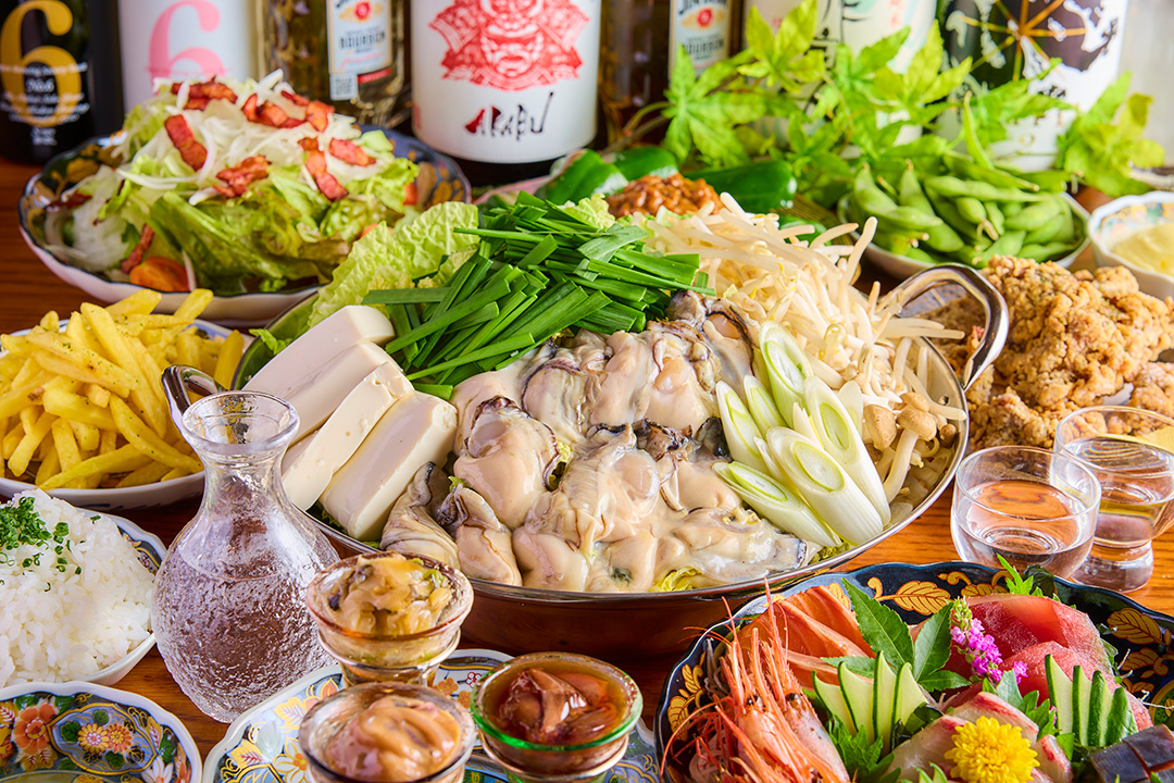 贅を尽くした最上級プラン。刺身5点盛りや酒肴3点盛り合わせをはじめ、濃厚な旨みが広がる牡蠣鍋をメインにした豪華10品。落ち着いた会食や特別な一日を華やかに演出する、店の魅力を余すことなく堪能できるプレミアムコースです。