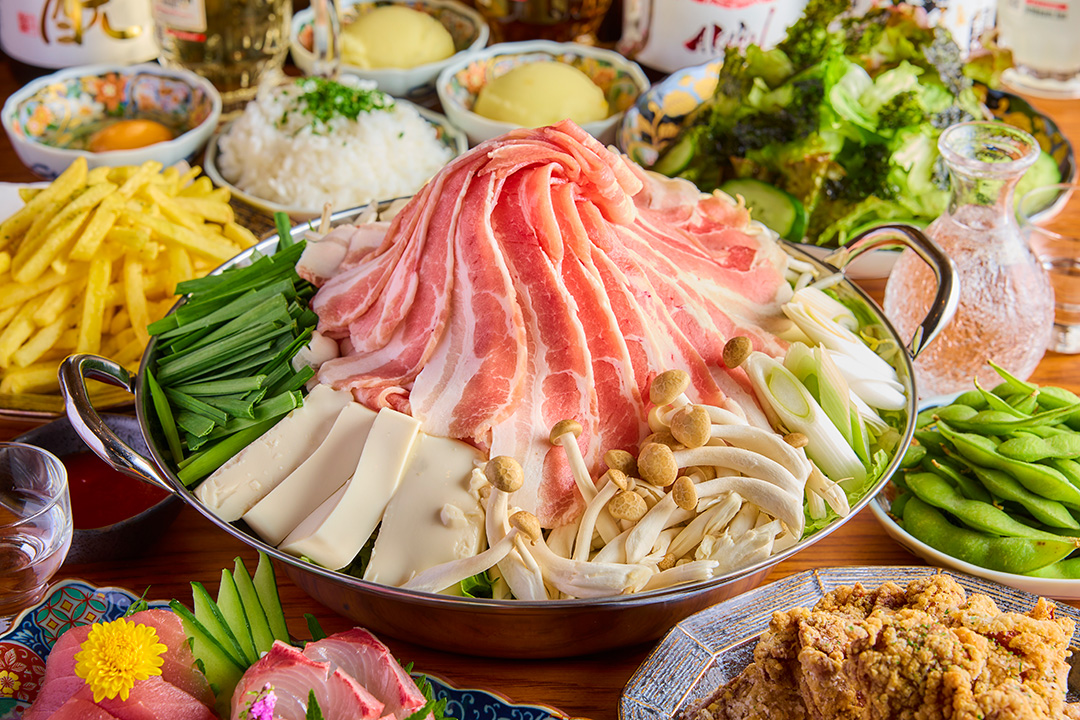 迷ったらまずはこれ。刺身2点盛りや豚バラ肉の包み鍋、唐揚げなど、人気メニューをバランスよく詰め込んだ全8品。ボリュームと満足感の両方をしっかり押さえた、初めての方にもおすすめの定番コースです。