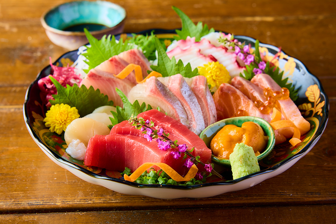 日本酒との相性も抜群!新鮮な海の幸を贅沢に楽しめる刺身盛り合わせ。濃厚な旨みのマグロ、とろける食感のサーモン、上品な甘みの鯛、しっかりとした歯ごたえのカンパチとハマチ、繊細な味わいのヒラメ、そして贅沢なフグの美味しさを存分にご堪能ください。