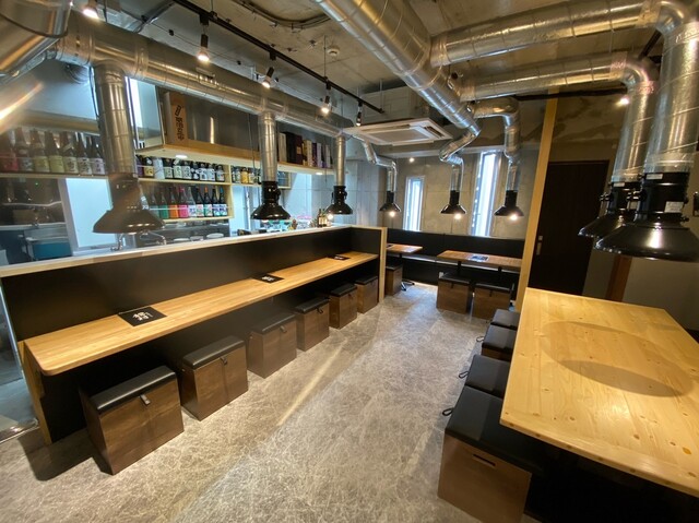 約14坪・28席の店内は、恵比寿の新築ビルのフルスケルトン状態から空間づくりをスタート。オープンキッチンに面したカウンターの前には、大きなテーブルを囲むように席を配置し、客同士の距離が自然に近づくレイアウトに。会話が生まれやすい設計が、ホルモン焼肉を囲む時間に心地よい一体感をもたらしている。奥にはゆったりと過ごせるテーブル席も用意されている。
