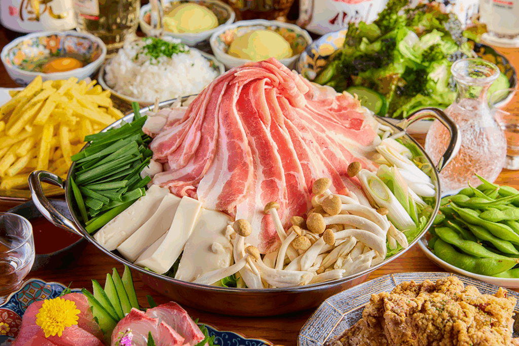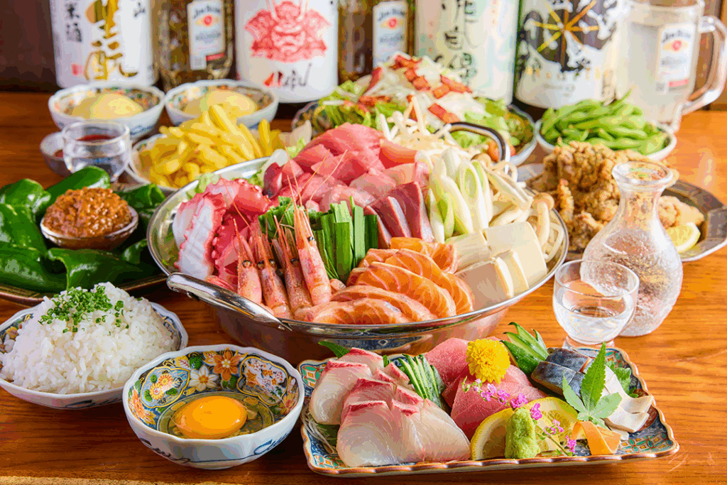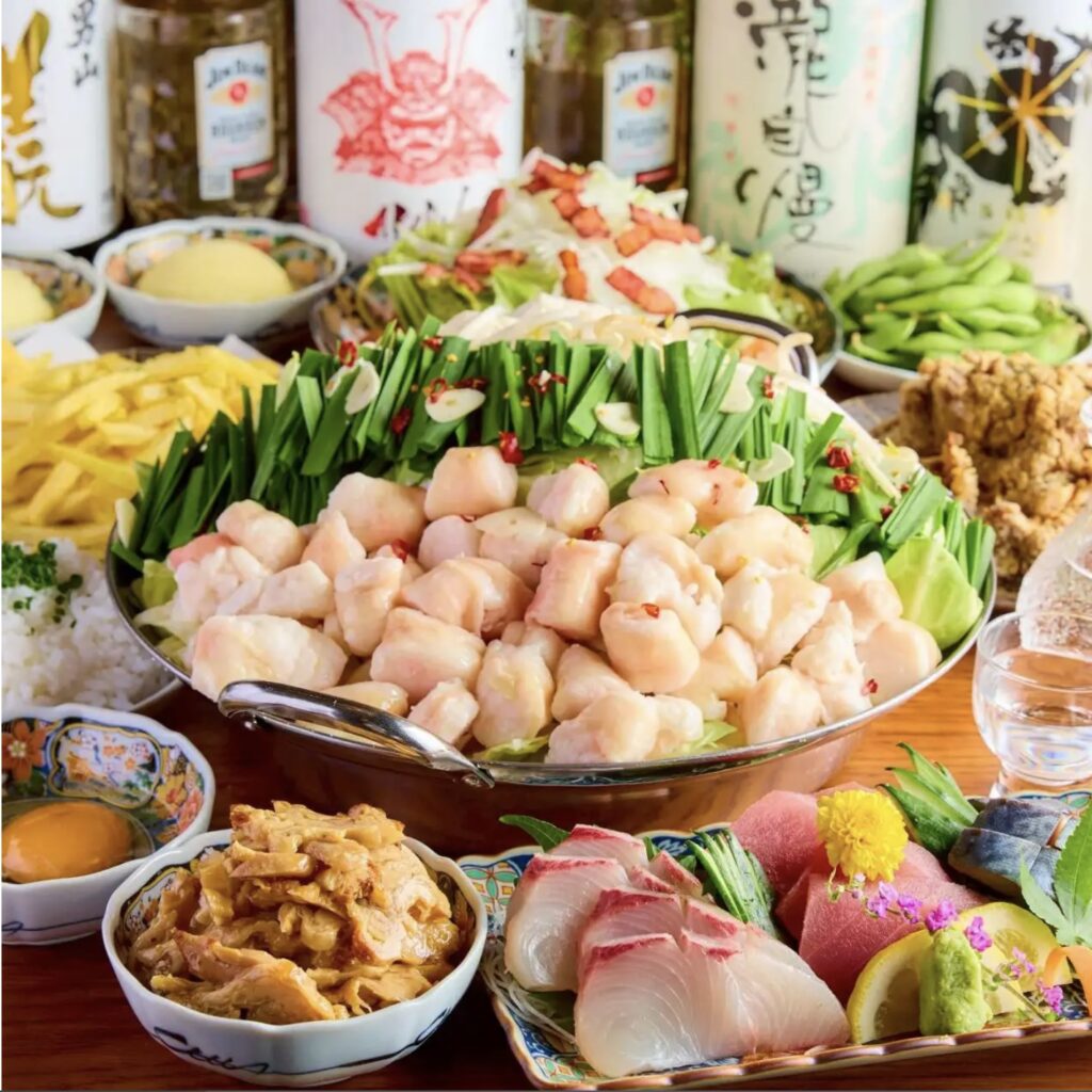コリッとした鶏皮ポン酢や刺身3点盛りなど、日本酒との相性が良い料理を前半にしっかり揃えています。特製スープで煮込んだ国産もつ鍋は、出汁に旨みが溶け込んでいるため、〆の雑炊まで飽きずに楽しめます。