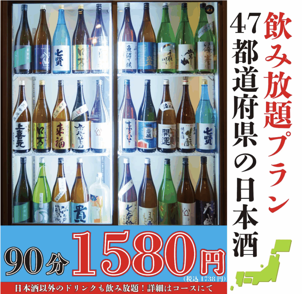 さらに、+550円で全国47都道府県の日本酒を追加できるため、日本酒好きの方が集まる宴会にも対応しています。
