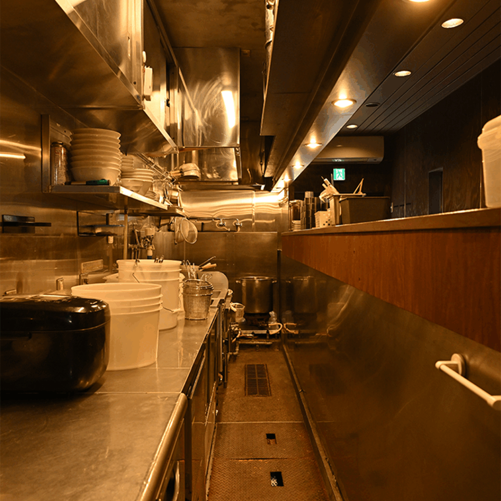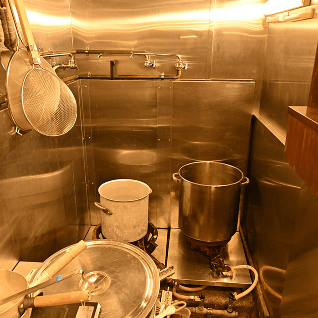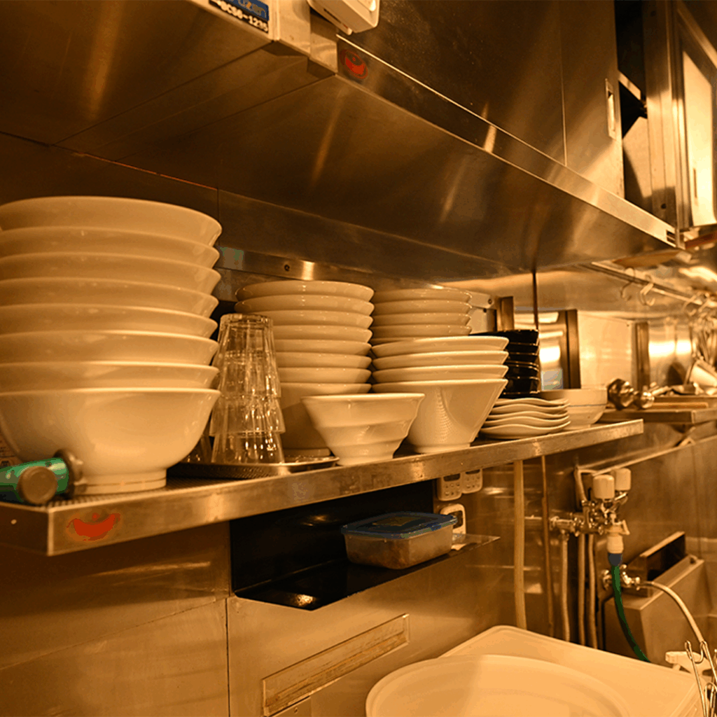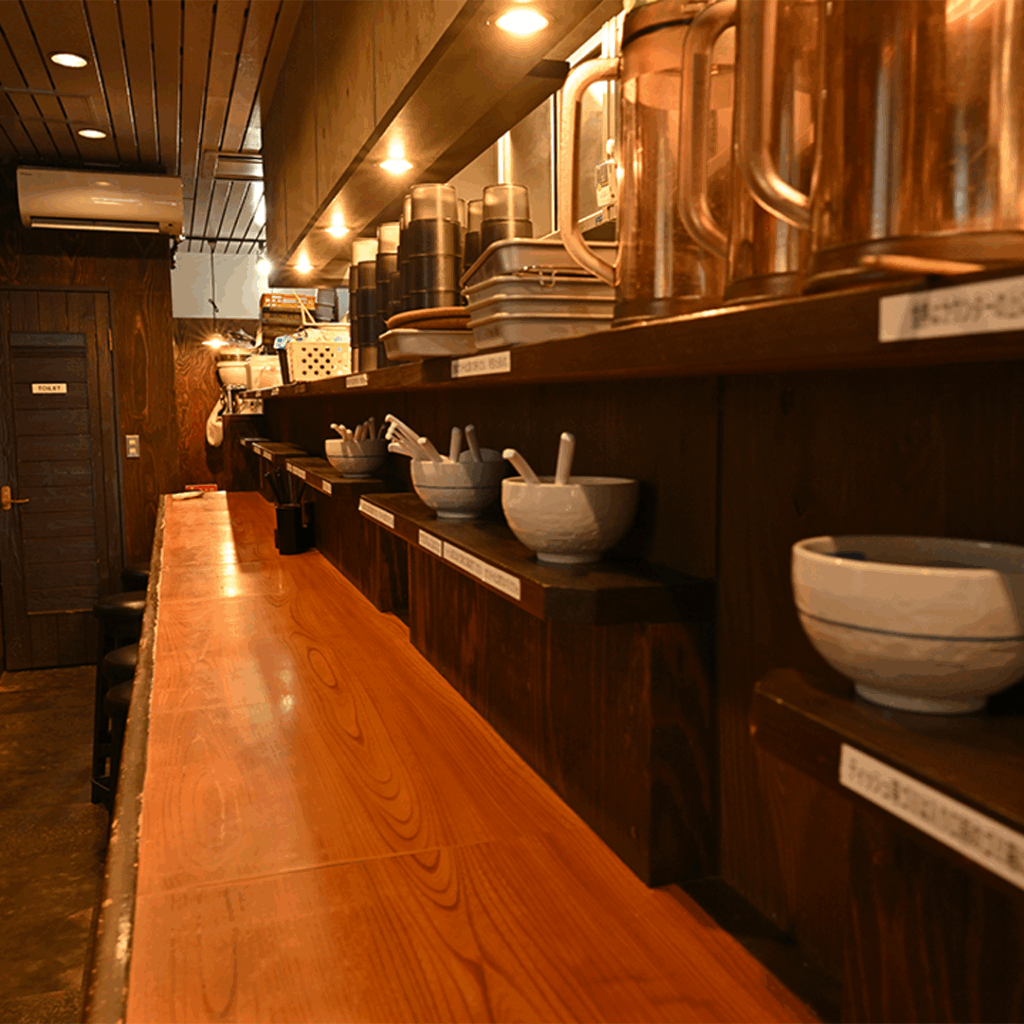 カウンターに備え付けのテーブルラックは、調味料やペーパータオルなどの小物を置くスペースとしてとても便利です。また、キッチンスペースからそのまま料理を提供できるため、ラーメン以外の焼き鳥・立ち飲み居酒屋などの開業にもおすすめ。