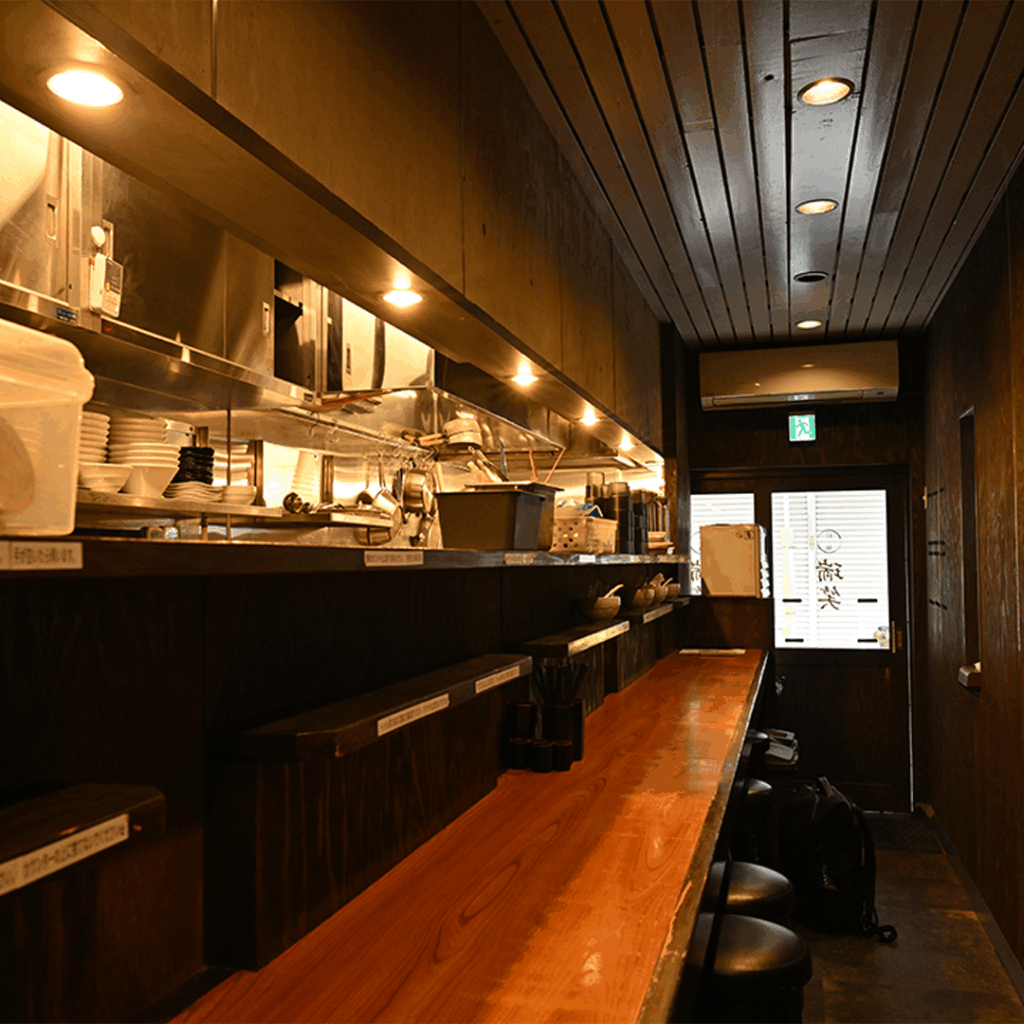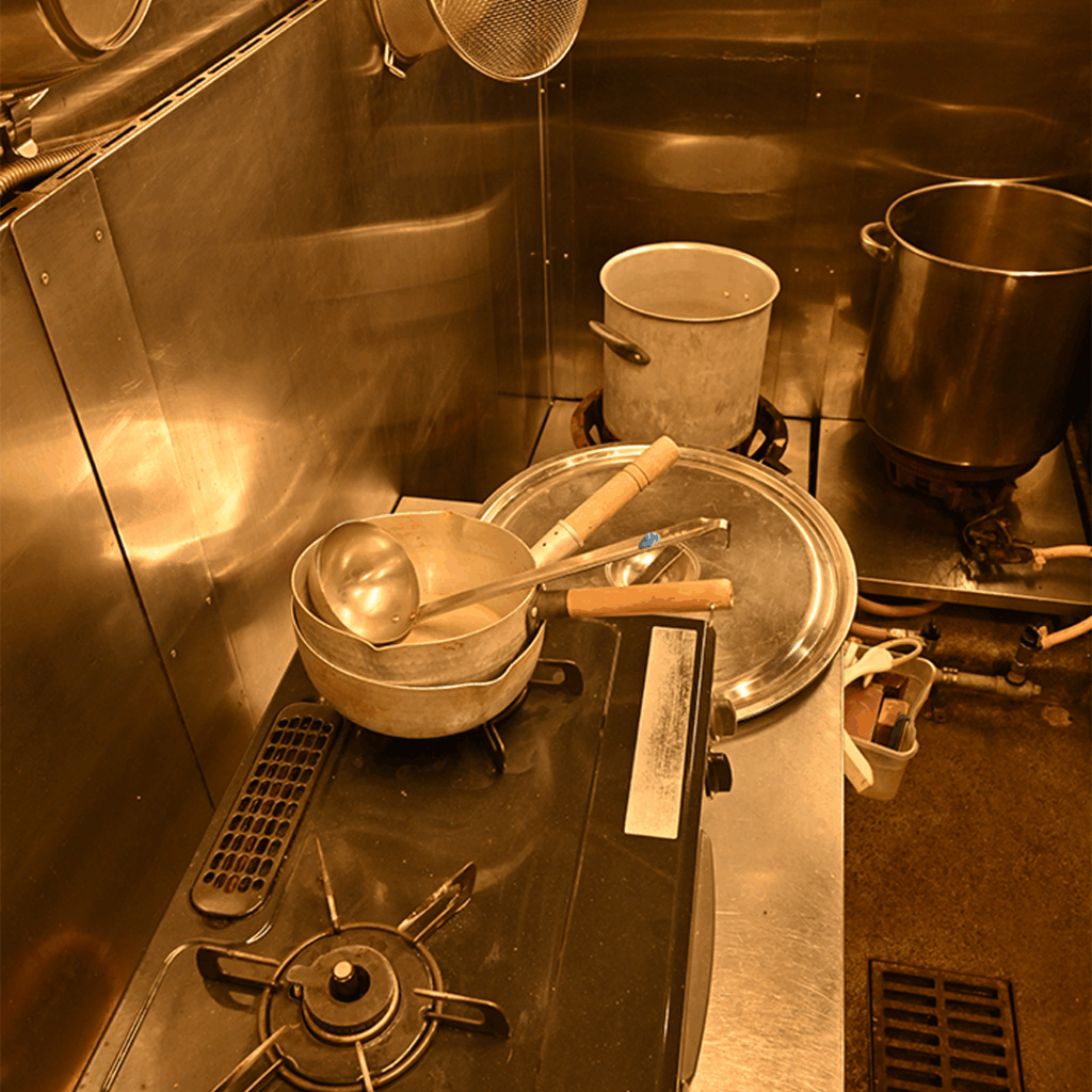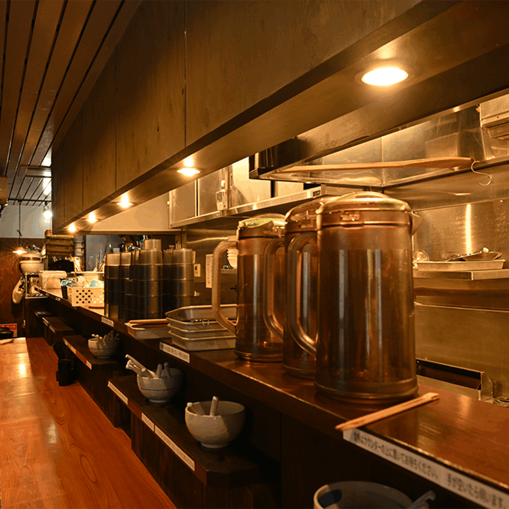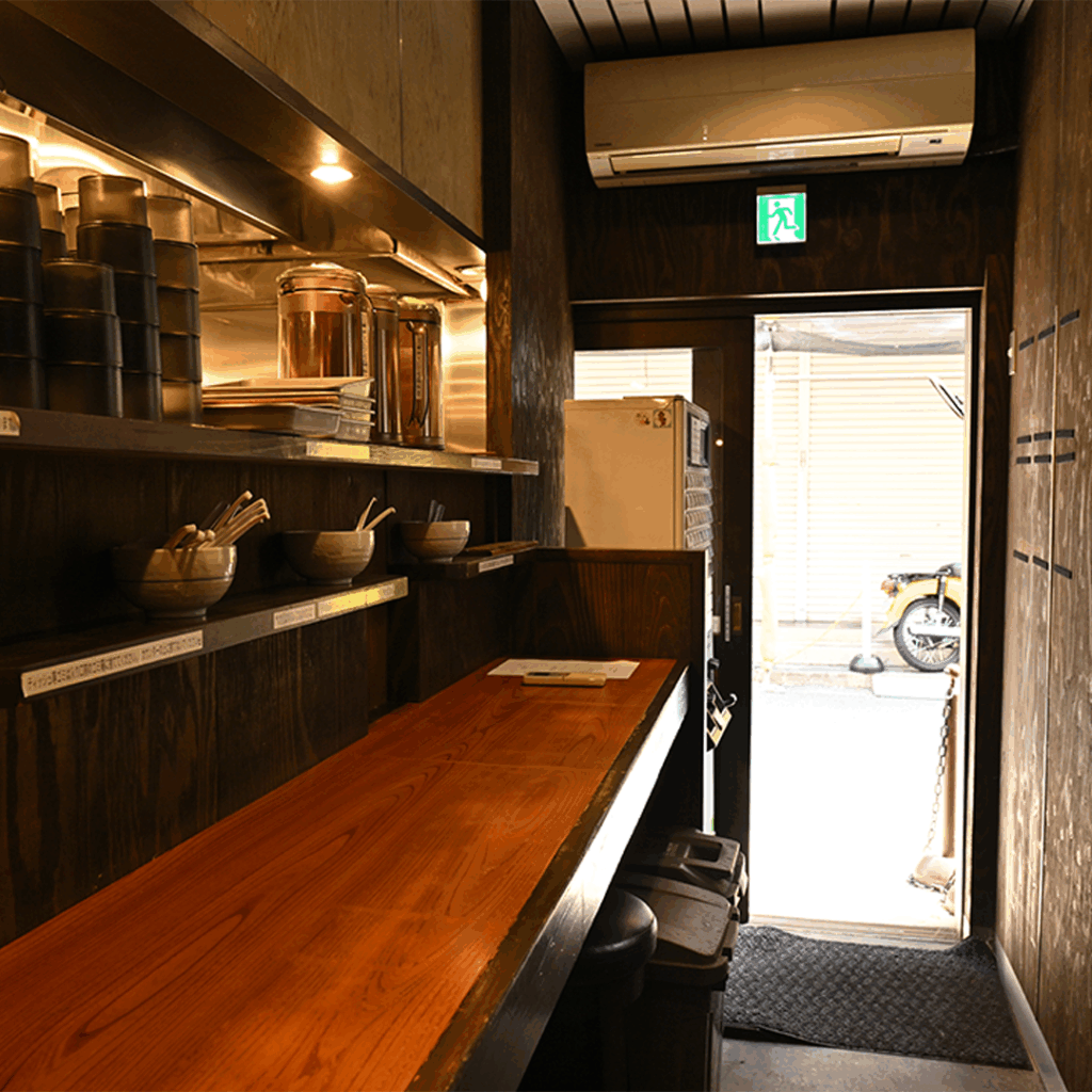 カウンターに備え付けのテーブルラックは、調味料やペーパータオルなどの小物を置くスペースとしてとても便利です。また、キッチンスペースからそのまま料理を提供できるため、ラーメン以外の焼き鳥・立ち飲み居酒屋などの開業にもおすすめ。
