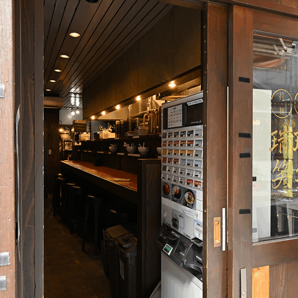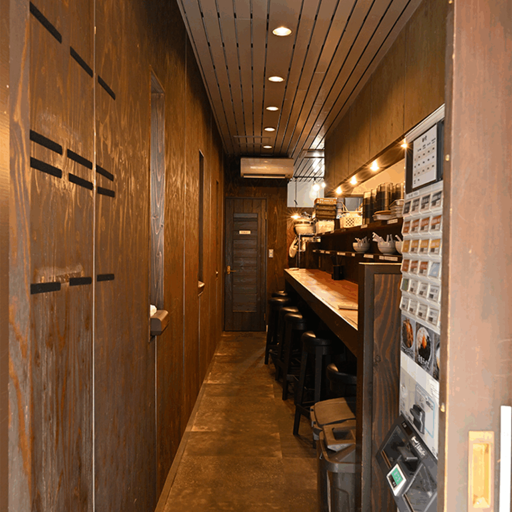 入ってすぐ右手には券売機スペース。カウンター席と奥行きを合わせることで、通路を塞ぐことなく設置可能です。