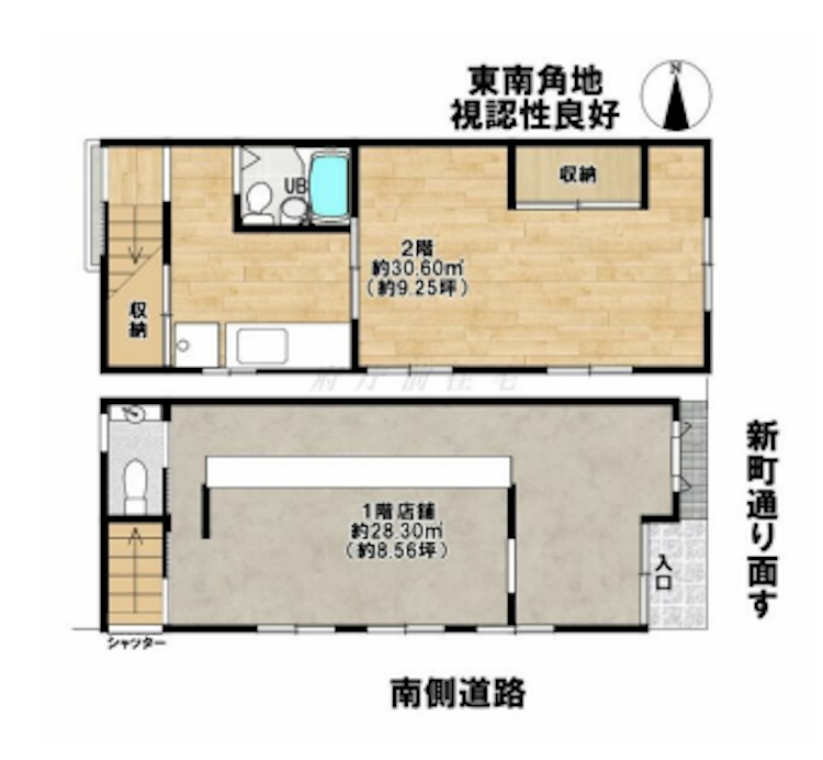主要採光面:南東向き 飲食店可 居抜き B・T同室 収納スペース 室内洗濯機置場 都市ガス